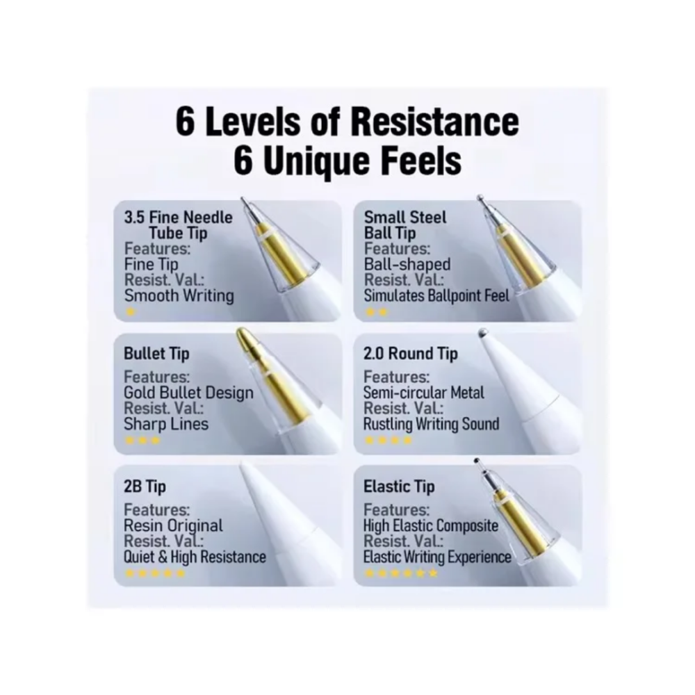 إذا كنت تستخدم قلم الآيباد للرسم، التدوين، أو التصميم، فهالمجموعة تعطيك تحكم كامل في تجربة الكتابة حسب أسلوبك. كل رأس مصمم بمواد مختلفة ومقاومة متدرجة، عشان تختار الإحساس اللي يناسبك بدقة.